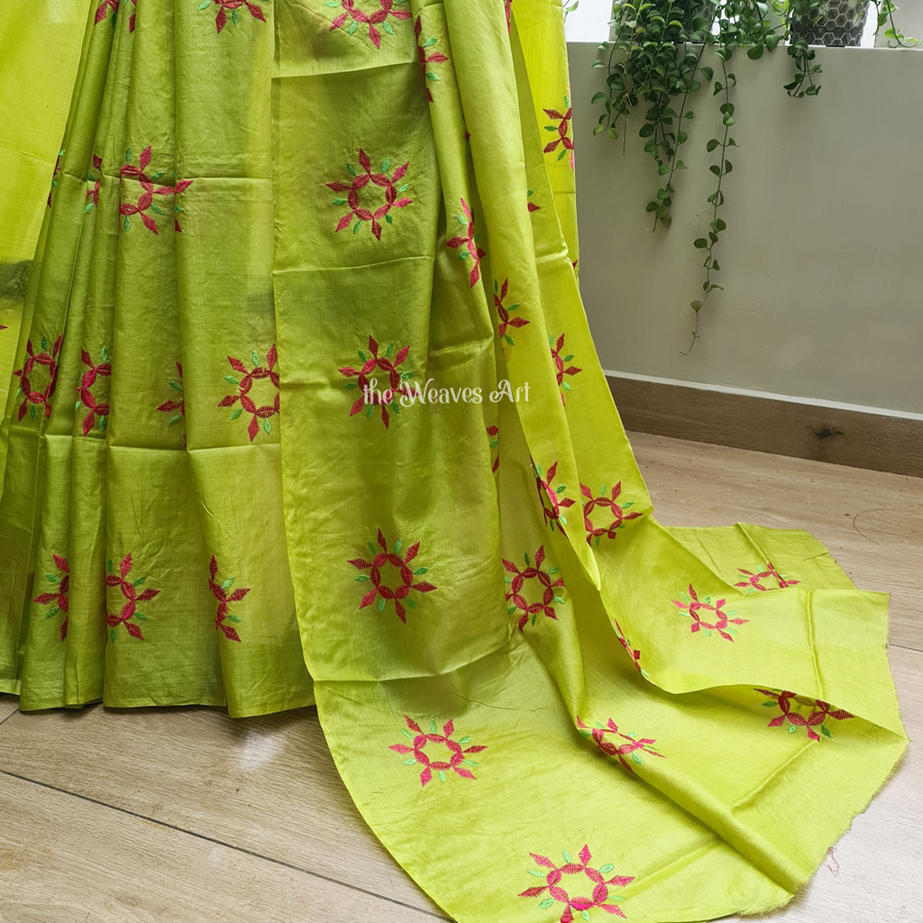 Vintage Chartreuse Tussar Silk Embroidery Saree