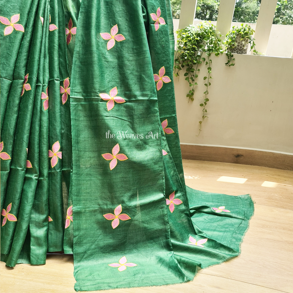 Sea Green Desi Ghicha Silk Embroidery Saree