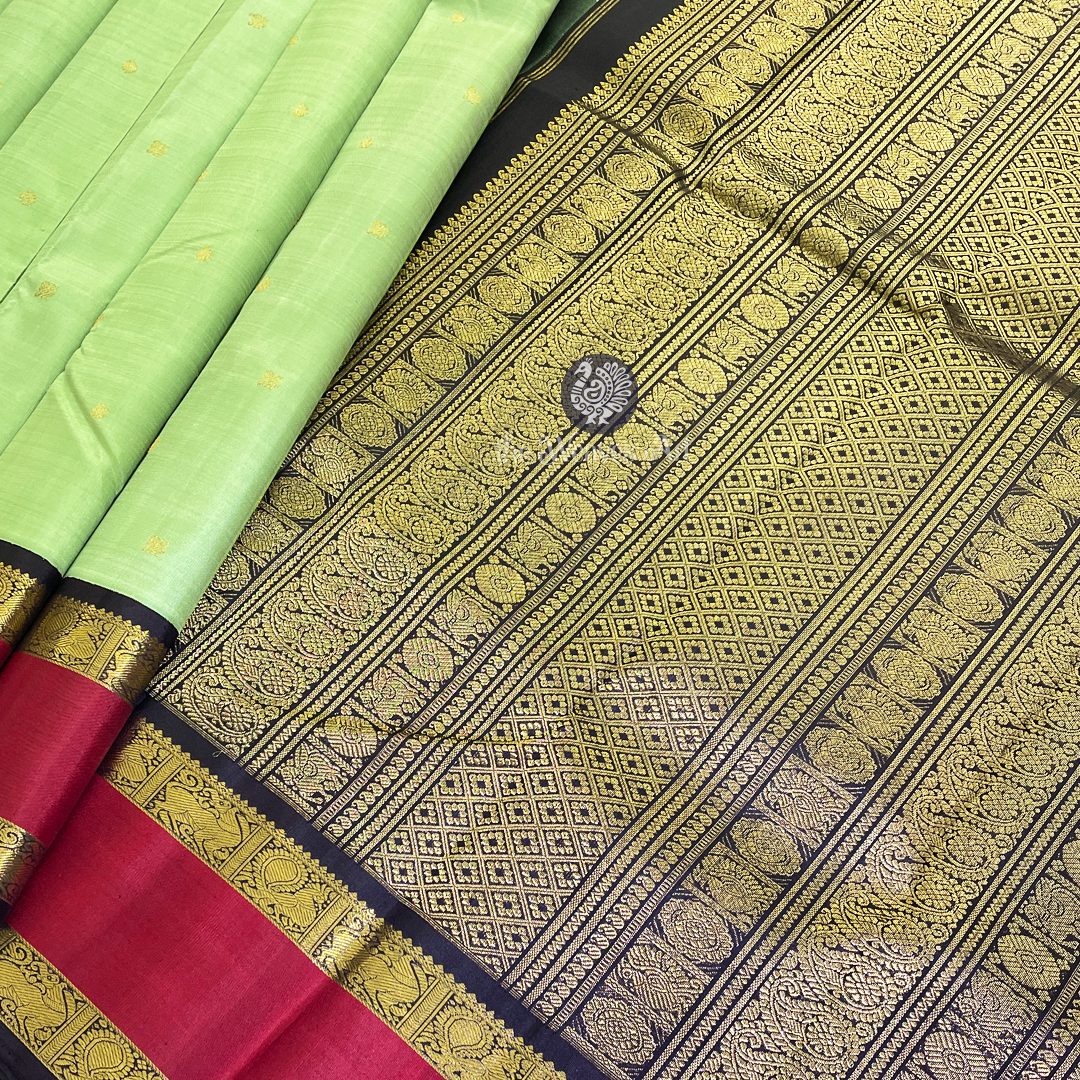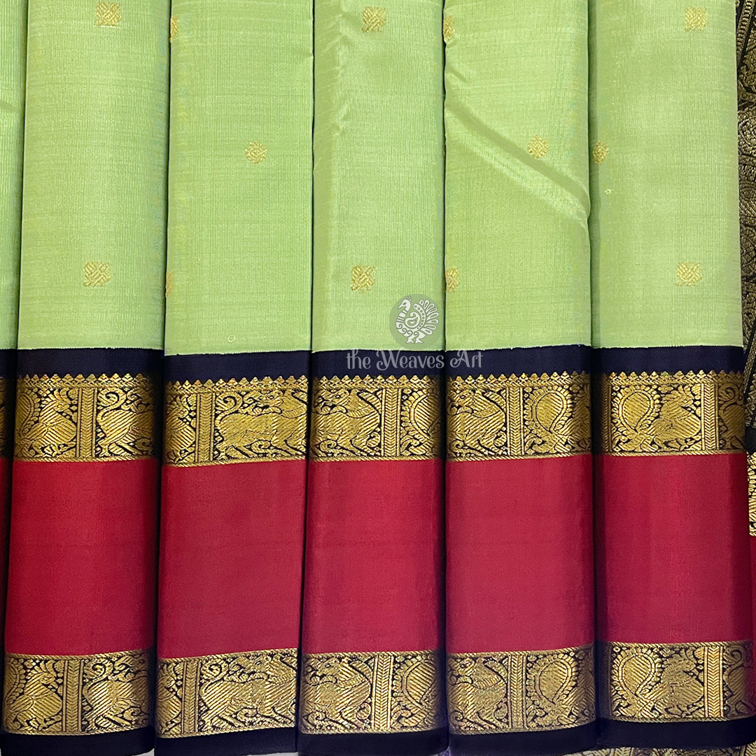 The Enchanting Udal (Saree Body): The body of the saree blooms with beautifully rendered petite "Mayil–Kamalam buttas", woven in pure zari using a half-repeat pattern. Each shimmering motif glitters delicately against the serene Elakai Pacha silk, creating an elegant interplay of light, texture, and tradition.