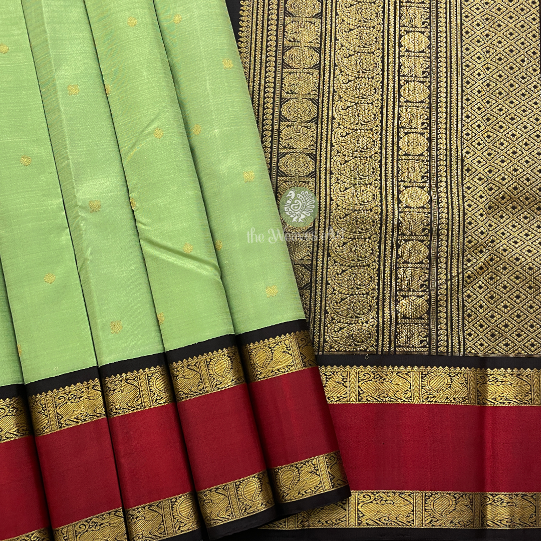 Wrap yourself in the divine grace of Shrikari, our handloom Kanchipuram Pure Silk Saree, where every thread whispers of tradition, devotion, and timeless artistry. In the serene glow of Elakai Pacha - the soft, meditative green of cardamom pods, this Korvai creation unfolds like a sacred hymn woven in silk and pure zari. A creation destined not just to be draped, but to be cherished, passed on, and remembered in the stories of generations.