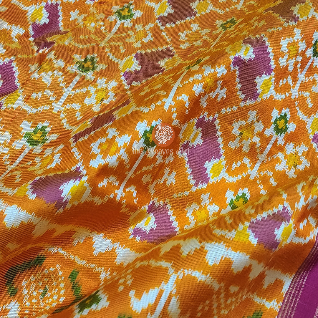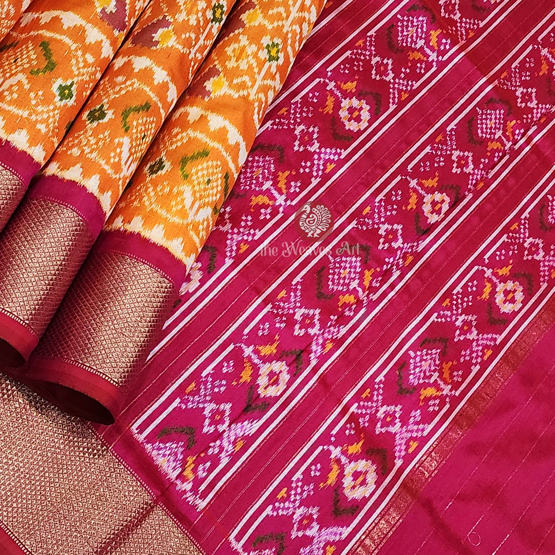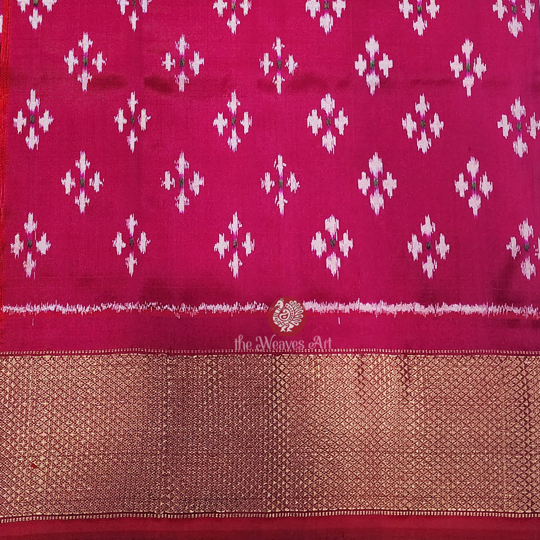 Saree Border: Framing the saree are striking gold zari kaddi borders on both edges, woven against a medium dark shade of pink base. The intricate diamond twill weave within the zari captures light with every movement, casting a luminous, regal shimmer. Just above the bottom border, multicoloured Patola Ikat floral motifs enclosed in triangular Ikat specks in ivory add layers of richness and artistry. This opulent border elevates the saree’s grandeur, lending it a stately presence that is both commanding and graceful.