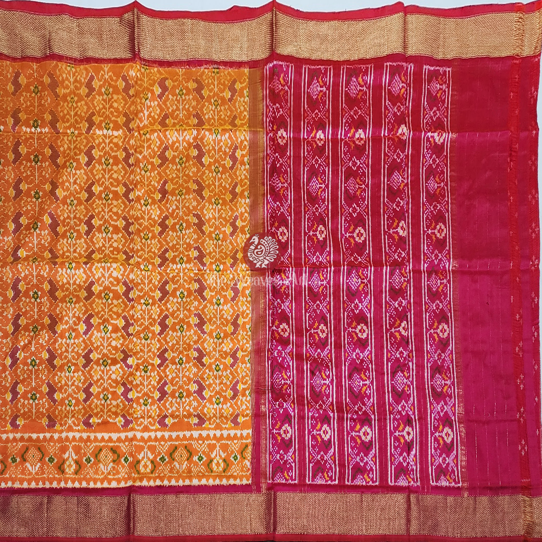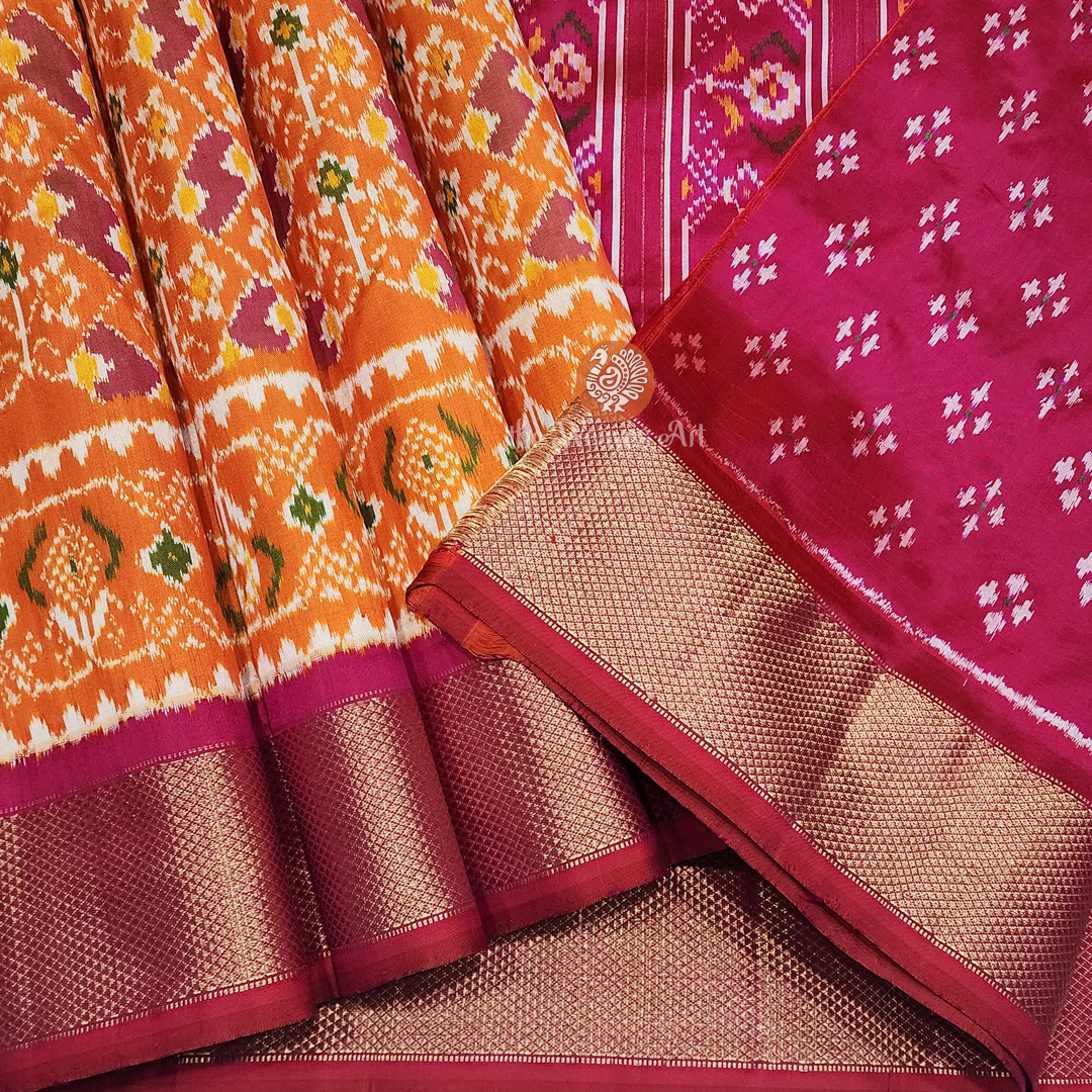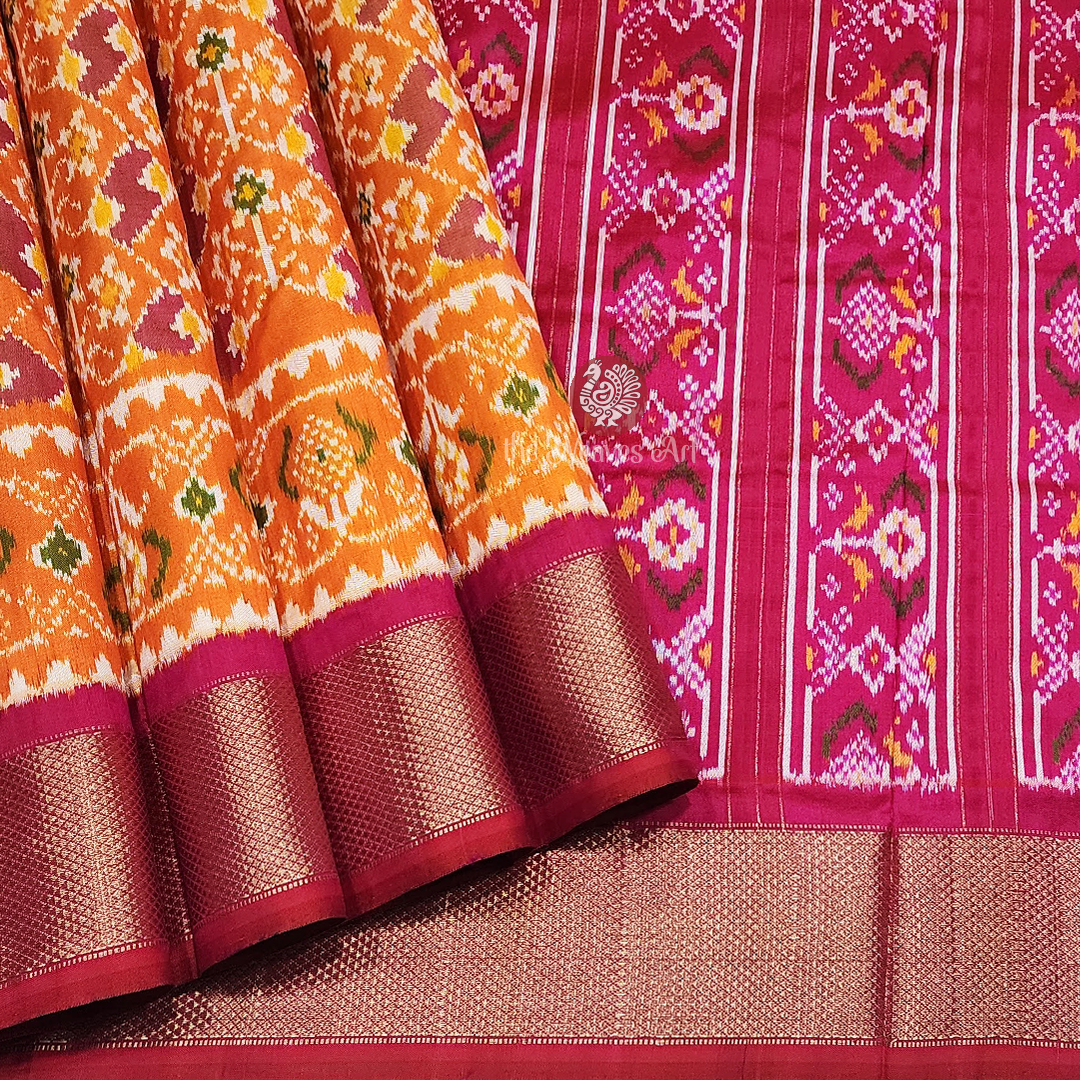 Saree Border: Framing the saree are striking gold zari kaddi borders on both edges, woven against a medium dark shade of pink base. The intricate diamond twill weave within the zari captures light with every movement, casting a luminous, regal shimmer. Just above the bottom border, multicoloured Patola Ikat floral motifs enclosed in triangular Ikat specks in ivory add layers of richness and artistry. This opulent border elevates the saree’s grandeur, lending it a stately presence that is both commanding and graceful.