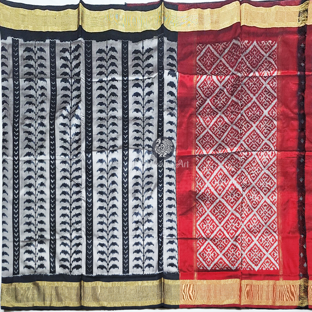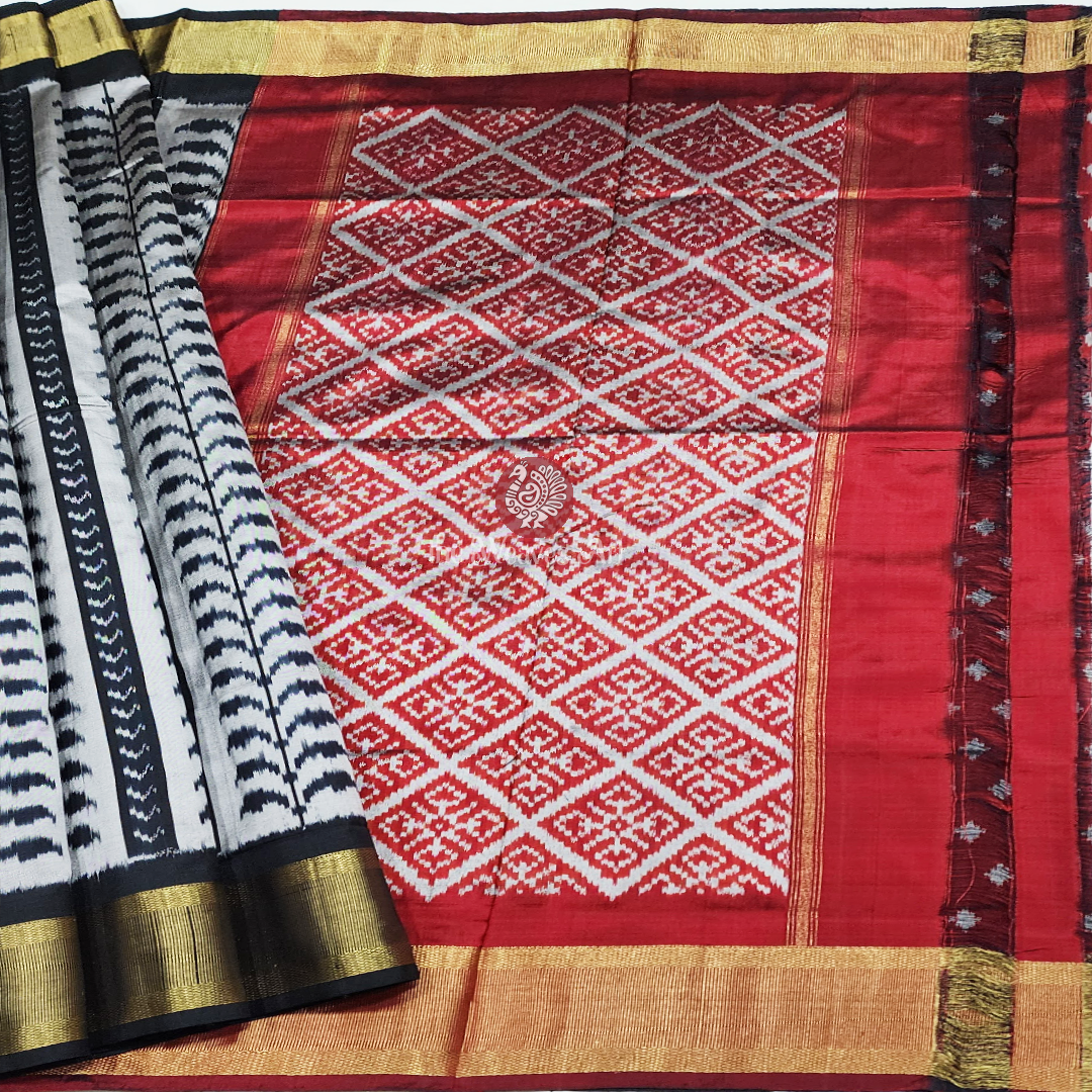 Saree Border: Framing the saree with regal brilliance are radiant gold zari borders, meticulously woven with vertical lines enclosed within diamond weave bands. This luminous detailing graces the edges along a black selvedge with a stately grandeur, elevating the saree with a glow that feels both traditional and timeless.