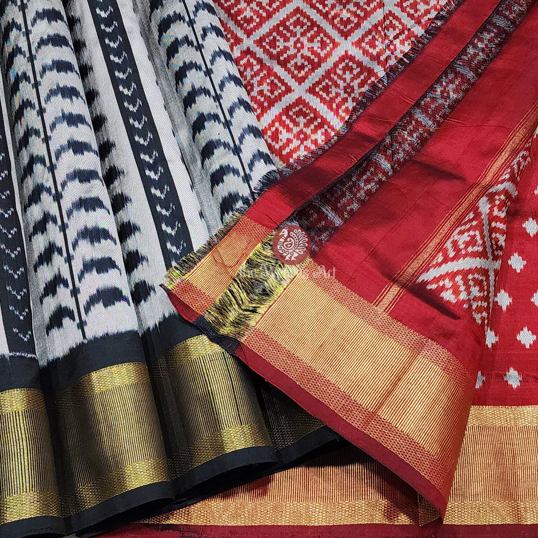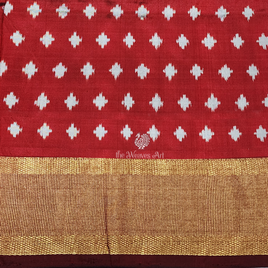 Saree Blouse: Complementing the saree is an unstitched blouse in a delightful crimson glory shade, delicately embellished with cream-colored ikat specks. Finished with a striking gold zari border that mirrors the saree, the blouse completes the ensemble with cohesive elegance and timeless charm.