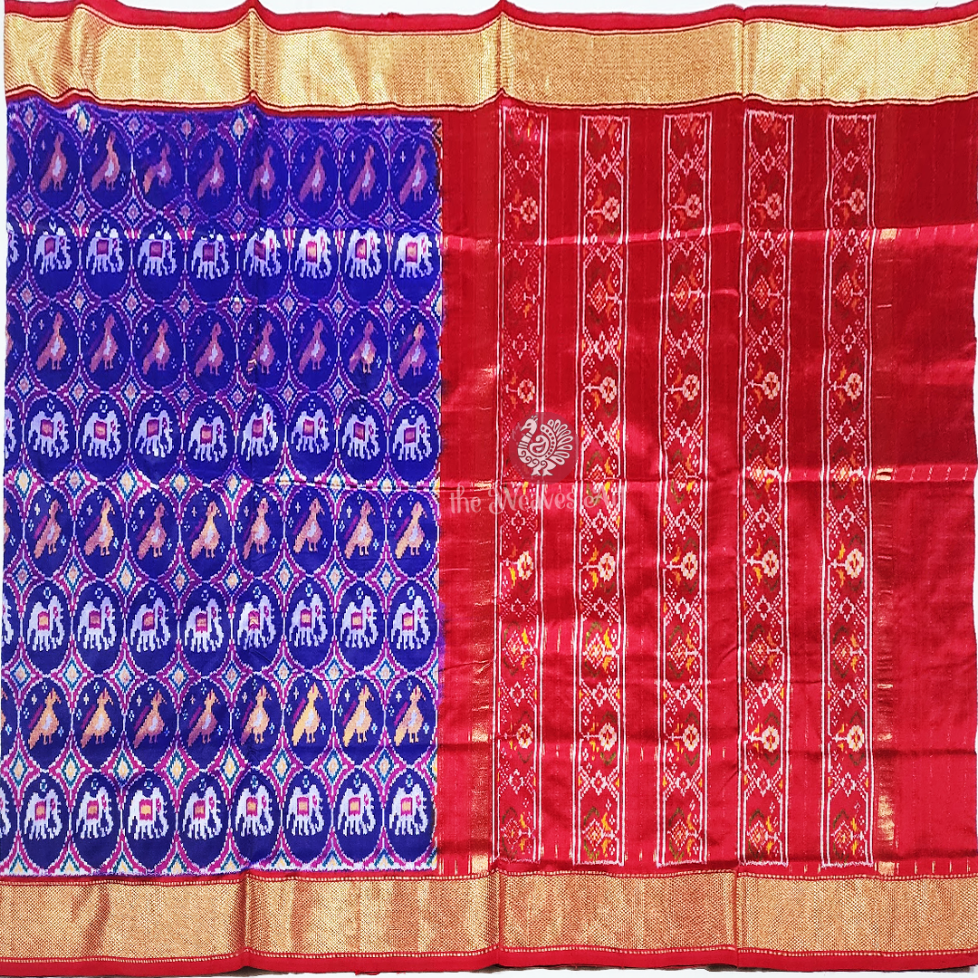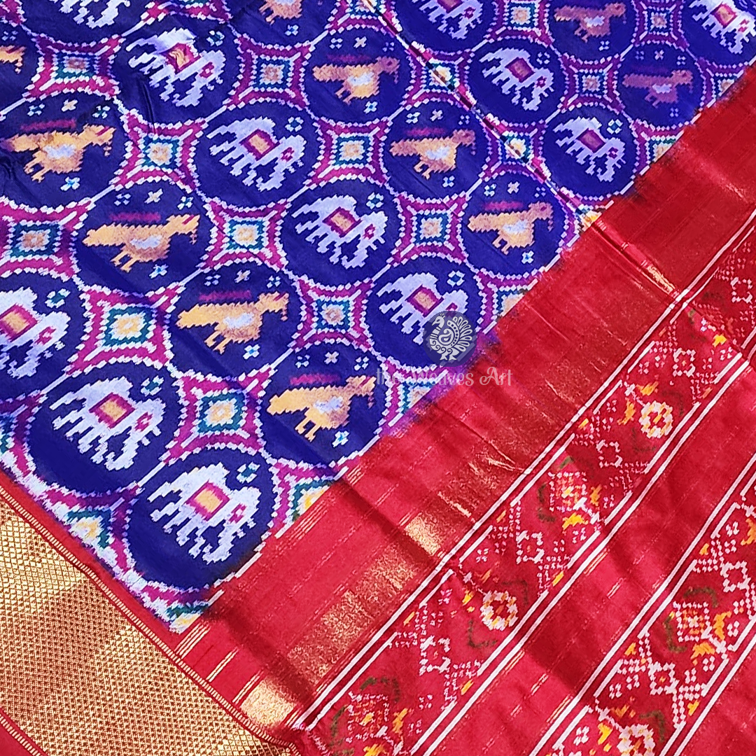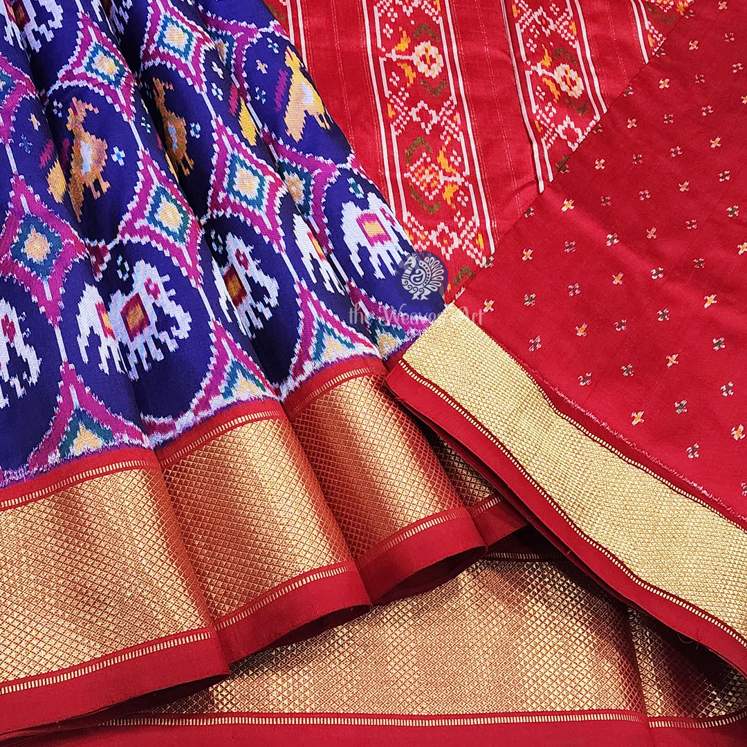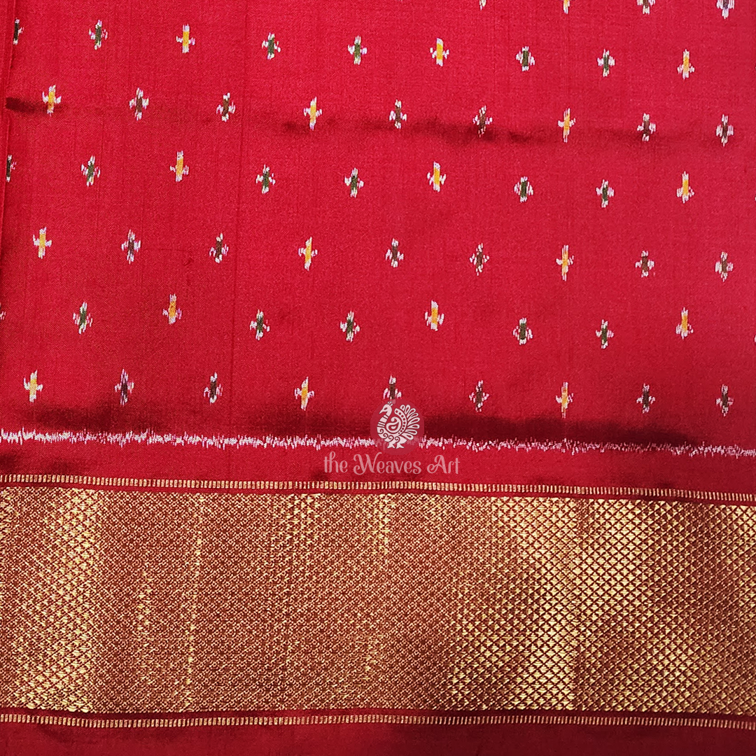 Saree Pallu: The drama deepens with the luxuriant fire-engine red pallu, adorned with a captivating medley of multicoloured Patola Ikat floral motifs. These designs unfold in five delicate rows, separated by an enchanting ikat hourglass pattern. Each row is gently highlighted with slender lines of golden zari, while resplendent gold zari bands embrace the edges - bestowing radiance, richness, and a statement of unparalleled elegance.