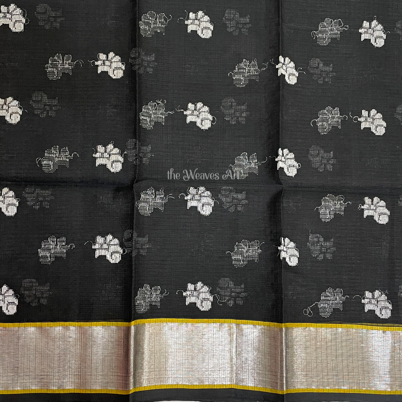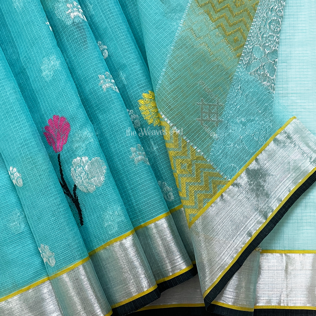 Saree Body: The body is a flowing arrangement of details, composed with care. Vertically aligned "floral motifs in silver zari" are spaced with a subtle rhythm across the saree. Interspersed among them are "inflorescence-inspired florals", each cluster delicately woven in three shades: bashful pink, marigold yellow, and luminous silver zari. Their pedicels, drawn in fine charcoal threads, anchor the blossoms, while deep teal leaves unfold around them with quiet depth. These elements are arranged in a soft half-drop pattern, giving the motifs a gentle rhythm. With every shift of light, the silver catches and releases, never loud, always poised.